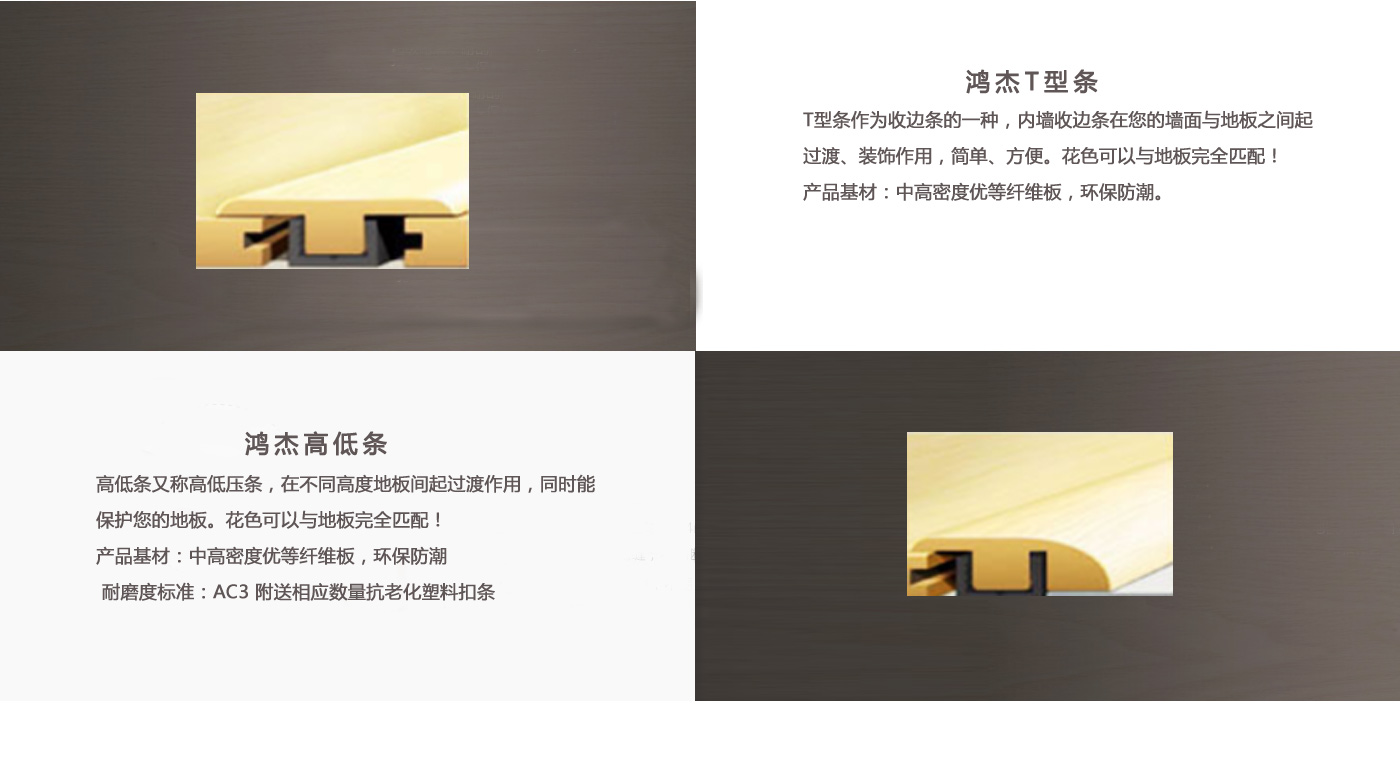 專業(yè)生產(chǎn)各類地板輔料。本廠成立于2008年,經(jīng)過嚴格的質量控制,已開發(fā)出SPC、WPC、層壓板三種不同的壓花材料。每一種材料都有超過7種不同的過渡型材,如t型線、減速器、端蓋、四分之一圓、樓梯前鼻、樓梯板、踢腳板等。